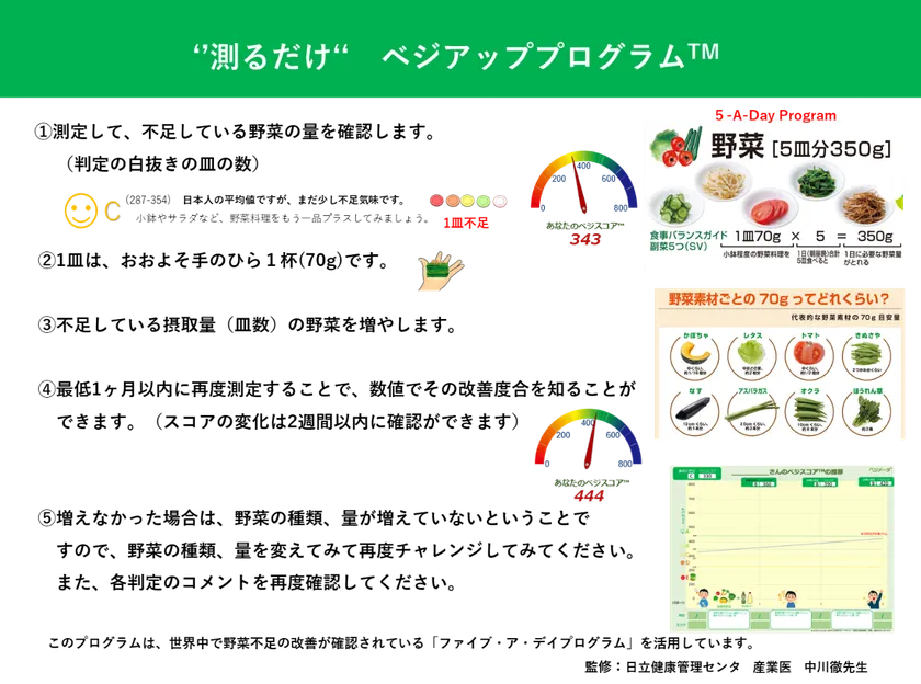 ベジメータ(R)で“測るだけ”野菜不足改善プログラム 「あと70gの野菜」の改善を目標に 日本の野菜不足解消に向けて開発