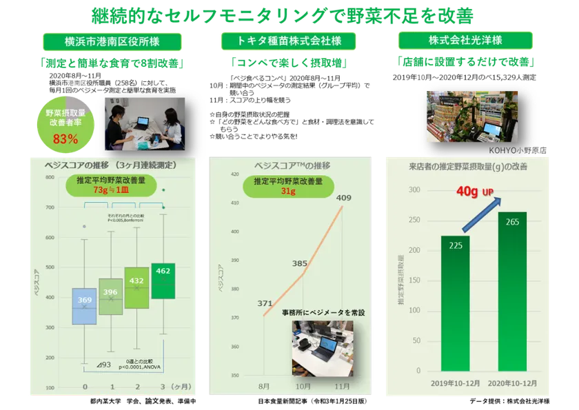 継続的なセルフモニタリングで、ベジスコア(TM)の改善により野菜不足が改善されることは、これまで報告された様々な職域 2)のみならず、事務所やスーパー、調剤薬局の店舗に「設置する」だけでも改善することが確認をされております。