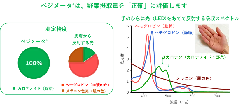 ベジメータ(R)は、分光器(スペクトログラフ)を搭載し、米国特許である「圧力媒介反射分光法 7)」により、野菜摂取量とは関係のないヘモグロビン、メラニン色素の影響を全く受けず、皮膚のカロテノイド量だけを「正確」に測定します。