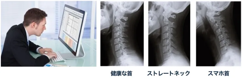 スマホやPCを長時間見続けることで、ゆるやかにカーブしているはずの頸椎(首の骨)が真っすぐになり、前に出てしまうのが「スマホ首」や「ストレートネック」と呼ばれる状態です。このような状態になると、首や肩のこりの原因となり、ひどい場合は頭痛やめまい、耳鳴り、腰痛を引きおこすこともあります。