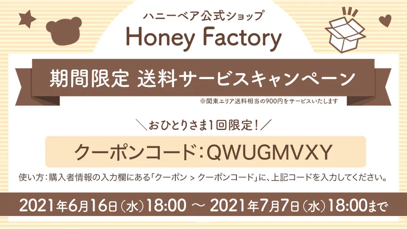 なお、キャンペーン期間中は、『ハニーファクトリー』( https://shop.honeybear.jp/ )にて、どなたでもご利用できる送料サービスクーポン(900円相当)の配布を実施致します。