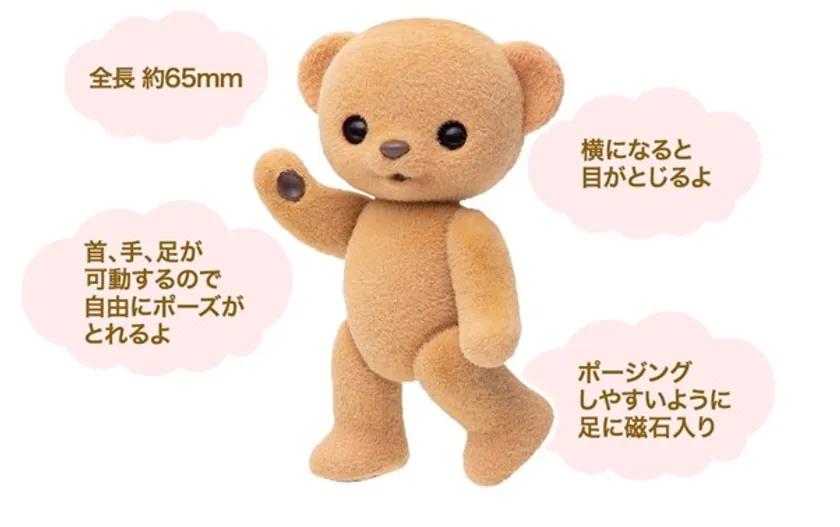 「ハニーベア」は全長約6.5cmのクマのフロッキードールです。横になると目が閉じたり、自由なポージングが出来たりと、小さいながらも細部までこだわり抜かれた作りが特徴です。