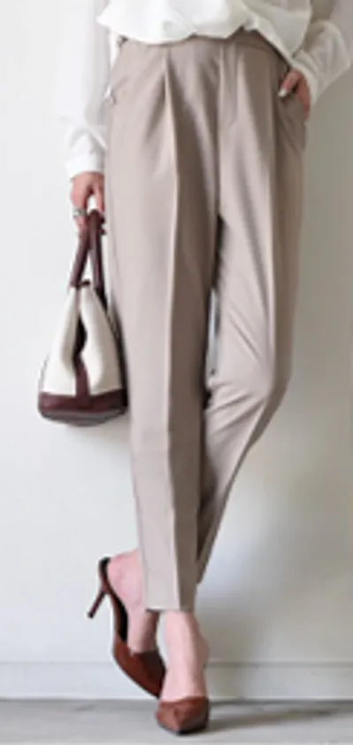 センタープレス入りで脚のラインをキレイに見せてくれるパンツ。さらっとしていて張り付かず、柔らかい肌触りとウエストのバックゴム仕様がストレスフリーな穿き心地です。気になるお腹や太もも周りをタックでゆるっとカバーし、裾に向かって細くなるシルエットがスタイルアップを実現。小尻効果が期待できるフェイクのバックポケットと、しゃがんでも安心な深めの股上も嬉しいポイント。シンプルでベーシックなデザインなので、オンオフ問わず重宝しそうな1枚です。