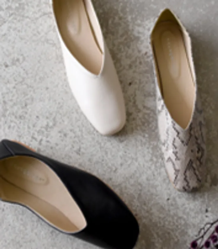 シンプルながらも脚をきれいに見せてくれるディテールが詰まったスクエアトゥシューズ。ぺたんこなのに華奢見えするデザインで、そのまま履いてフラットシューズとしても、或いはかかとを踏んでバブーシュとしても楽しめる2way仕様はお洒落の幅が広がりそうです。足の動きにぴったりフィットして曲がるソールは、全体にふかふかのクッションが入っていてソフトな履き心地が気持ち良く、靴底は細かい凹凸で滑りにくくなっているので、歩くのが楽しくなる“らくちんパンプス”です。