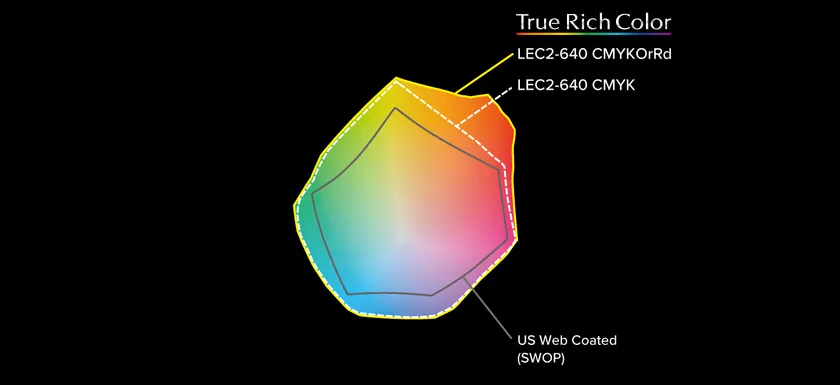 LEC2シリーズは、オレンジインクとレッドインクをプロセスカラーとしてコントロール。CMYK+オレンジ+レッドのプロセスカラー印刷による広色域な表現が可能になり、CMYK印刷に比べ約20%色域が拡大し、Pantoneカラーのカバー数も約200色増加します*2。また、ハードとインクのポテンシャルを最大限に引き出すTrue Rich Color印刷設定と組み合わせることで、見る人の心をとらえる、圧倒的な存在感を持ったグラフィックが製作できます。