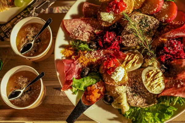 【オードブルプレート】パテドカンパーニュ / スペイン産ハモンセラーノ / モルタデラ / サーモンタルタル / 黒人参ラぺ / グリンリーフ / フリルレタス / さつまいものサフラン風味 / カリフラワーのアーリオオーリオ / 黒オリーブマリネ / トマトとリコッタチーズのブルスケッタ / ボイルエッグ アンチョビ/ クルトン / チーズラぺ / ローズマリー