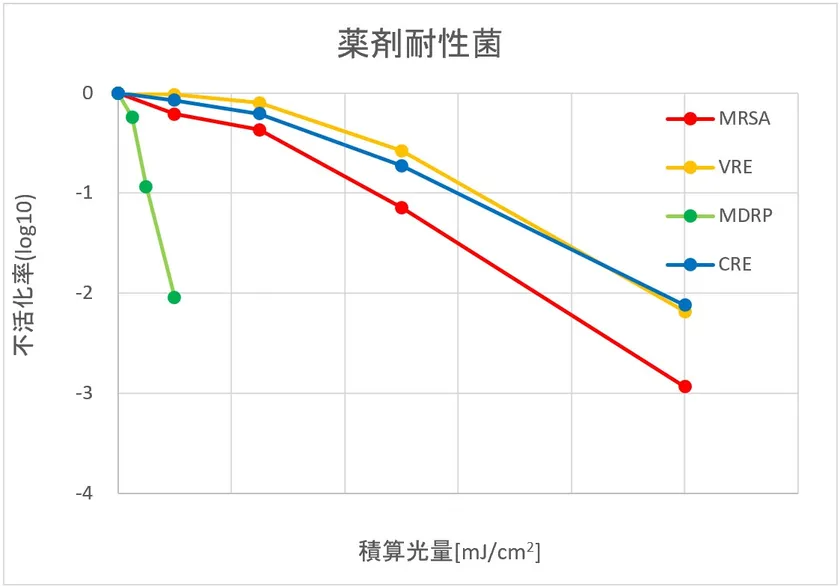 実験の結果、UV-LED約30秒照射後に4菌種すべての薬剤耐性菌の菌数が1/100以下にまで減少した。