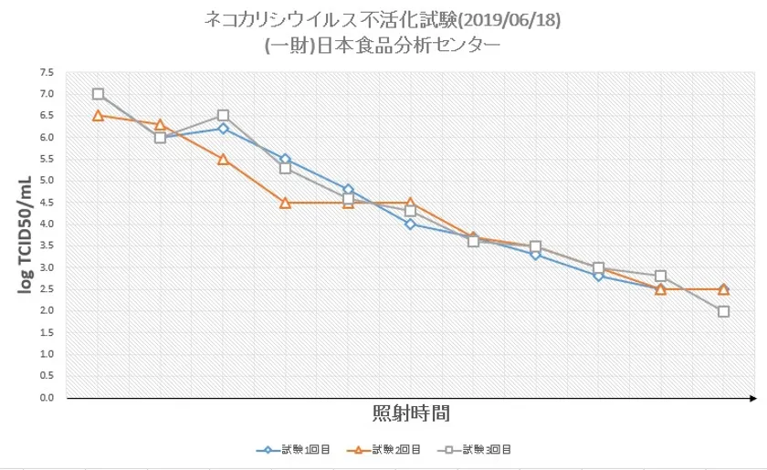 実験の結果、UV-LED照射後90秒以内に不活化率3log(99.9%)のウイルス不活化効果が見られた。