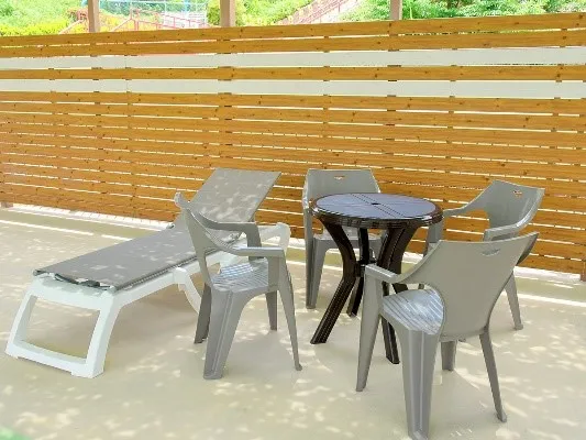 設 備:クッション付きデッキチェア2台、ミニテーブル1台、テーブル1台、チェア4脚