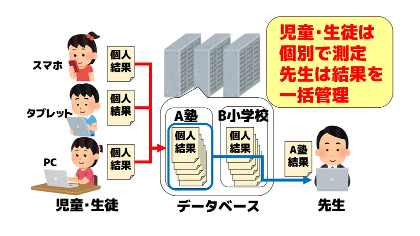 教育機関向けの団体利用モードでは、最初に先生が自分の学校や塾を登録し、学年やクラスなどのグループを作ります。次に、児童・生徒が語彙力の測定を行います。児童・生徒はそれぞれのPC・タブレット・スマホなどの端末からログインし、語彙力を測定します。測定結果は、データベースに保存され、先生は、全員の測定結果をネット上や、ダウンロードして確認できます。