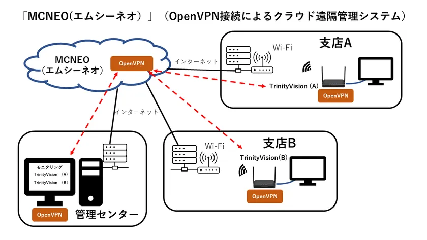 エムシーネオに対応したトリニティービジョンをインターネットにつなぐだけで、専用の管理クラウドとの間に仮想プライベートネットワークが構築され、管理クラウドからいつでも機器の設定変更やリモート監視を行うことができます。