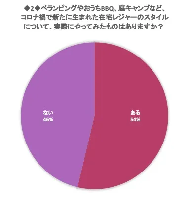 まず、「ベランピング」「おうちBBQ」といったコロナ禍に生まれた在宅レジャーについて、家庭で実践しているのかを尋ねたところ、54%が実施したとの回答でした。今回のアンケート回答者のうち6割近くが首都圏(1都3県)の在住者でしたが、こちらを除いたエリアの在住者で確認したところ、実施ありの回答者が5%以上増えたことから、マンション住まいやベランダが狭いといった住宅事情が実施可否に影響していると考えられます。