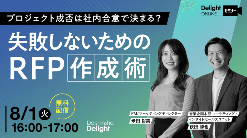 2023年8月1日(火)、WEBサイトの企画・デザイン・コンテンツ制作などデジタルマーケティングを支援している株式会社大伸社ディライトは、戦略的なサイトリニューアルと成功するRFP作成に焦点を当てたセミナーを開催いたします。