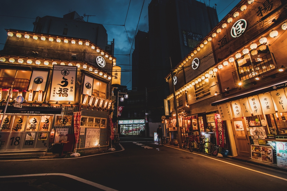 由緒ある木造建築に提灯が連なる東京大塚のれん街には、いろは歌になぞらえた(い)〜(る)の区画にそれぞれ店舗を構えます。