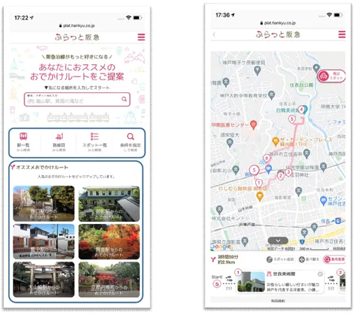 人工知能(AI)が自動でおでかけルートを編み出して地図で案内する「自動観光ルート提案」機能を導入。気軽に“ぷらっと”でかけて阪急沿線の新しい魅力に出会うことが出来るルートを提案するデジタルサービスです。おでかけ時間や行きたいスポットなど多彩な検索条件を設定して、あなたにおすすめのおでかけルートを探すことができます。
