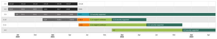 2021年6月の時点でサポートがされているのは、最新バージョンである3.11および3.10、3.9のみです。