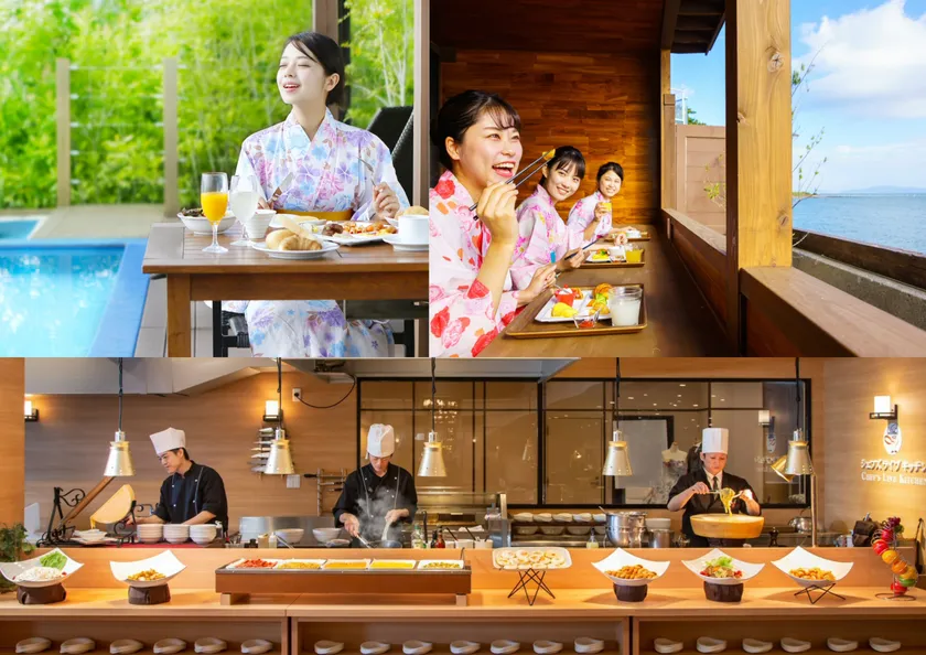 ご朝食は、ボリューム満点!和洋バイキングを海の見えるレストランにて快適にお召し上がりいただけます。
