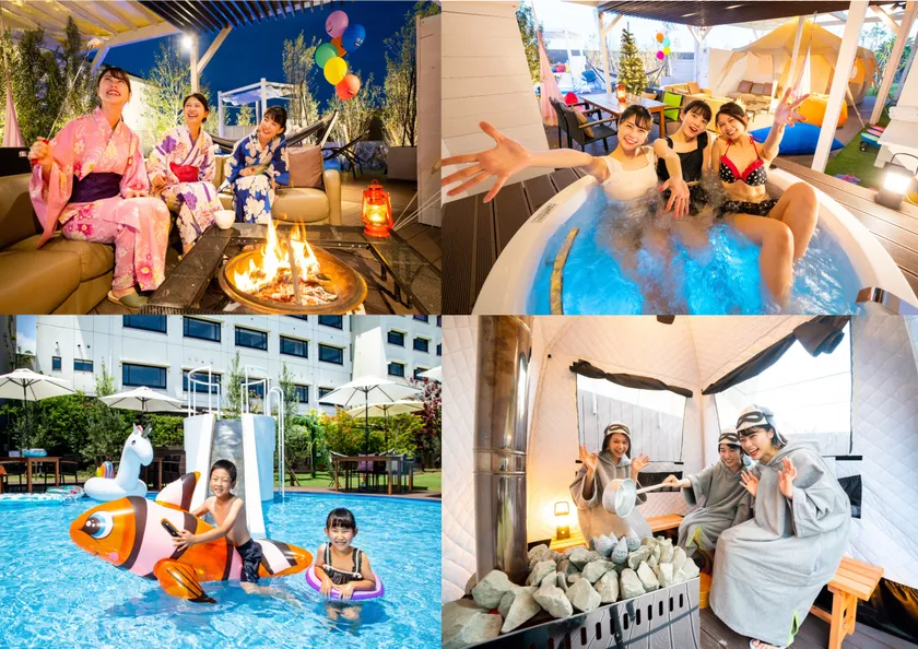 宿泊専用のガーデンテラスでのBBQはもちろんのこと、キャンプファイヤー、ジャグジー露天風呂、夏季限定キッズプール(深さ50cm、利用期間6/1~10/31)、今はやりのテントサウナ(別料金)もあり、一日中遊び放題!