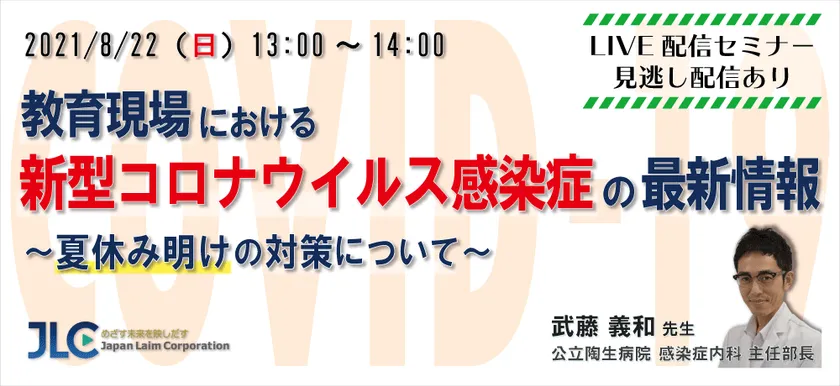 今回の配信では、コロナ制圧タスクフォース( https://www.covid19-taskforce.jp/ )の一員として、昨年の4月より新型コロナウイルスに関する最新の知見を発信し続け、学校現場での感染対策に関する書籍も執筆された、公立陶生病院 感染症内科 主任部長の武藤 義和先生より、新型コロナの最新情報、これからの感染対策について、分かりやすく解説いただきます。