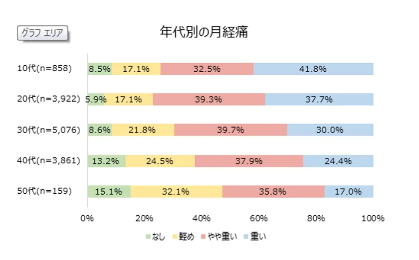 10代~50代女性の回答データを解析した結果、「重い」と回答した割合が10代では41.8%を占めたのに対して、20代では37.7%、30代では30.0%、40代は24.4%、50代は17.0%と、年齢を重ねるにつれて減少傾向にありました。また、「軽い」「やや軽い」は30代以降は年代ごとに増加傾向であることが分かりました。