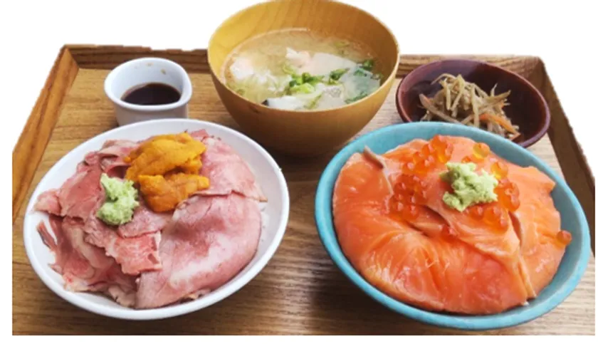 南足柄や箱根周辺の美味しい食材を2種類の丼ぶりに仕上げました。「ふるさとゴハン食堂」の大人気商品、「相州牛ウニとろ牛めし」と「金太郎マス」を使用した「金太郎マスといくら丼」のミニ丼セットです。ミニソフトもつきます。