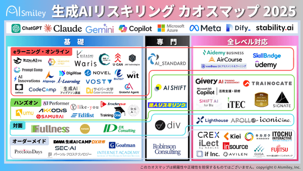 こうした背景を踏まえ、アイスマイリーでは、企業向けの生成AIリスキリング・研修サービスを網羅的に整理した「生成AIリスキリングカオスマップ 2025」を公開しました。本マップでは、eラーニング・対面研修・ハンズオン研修・アイデアソン・オーダーメイド型など、多様な研修形式を持つサービスをカテゴリ別に整理し、企業が自社に適したリスキリングプログラムを選択できるよう構成しています。