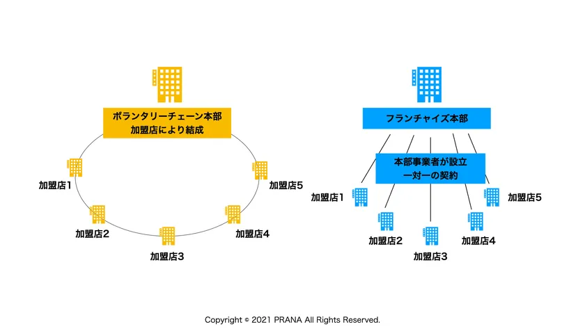 フランチャイズチェーン(FC)と同様に、加盟店を指導する本部がありますが、あくまで加盟店が主体です。独立した組織でありつつ、加盟店同士で情報共有を行い、横のつながりがあることが特徴です。