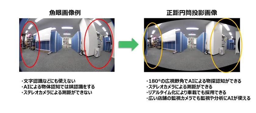 広角レンズや魚眼レンズで撮影された映像は画角が広すぎるために、レンズの中心から離れた映像ほど歪んで表示され、被写体の形状や大きさなどを判断することは難しいという課題があります。