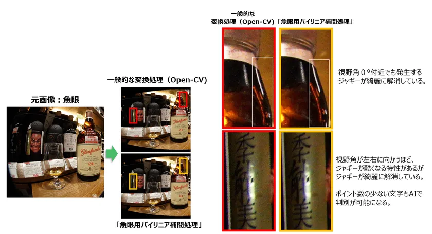 魚眼レンズから射影変換した場合、従来方式のニアレストネイバー補間方式ではジャギーノイズが発生し、元映像の再現性は低くなっておりました。一方で今回開発したバイリニア補間方式ではジャギー発生が少なく、顧客の映像体験の向上またAI処理の容易化に貢献します。