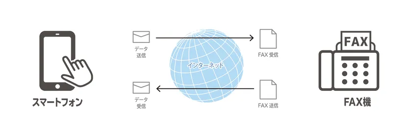 スマートフォンからインターネット回線(E-mail)を使って、FAXを送受信できるサービスです。外出先でもFAXの送受信が行えます。