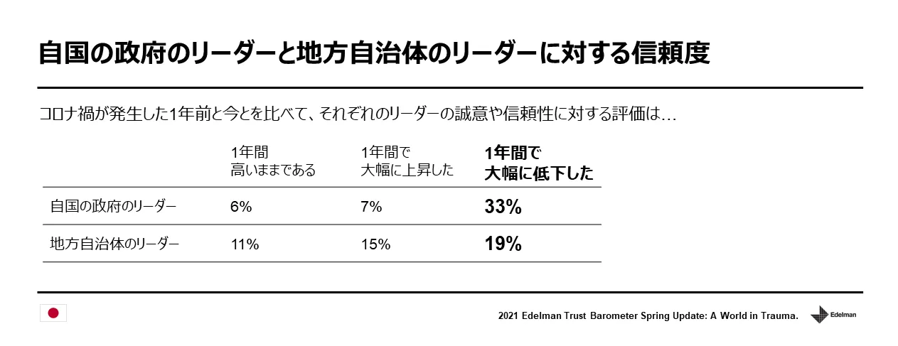 また、日本において自国の政府のリーダーと地方自治体のリーダーに対する誠意と信頼性を調査したところ、新型コロナ感染症が拡大した1年前と比較して「大幅に低下した」と回答した人は、政府のリーダーが33%、地方自治体のリーダーが19%となりました。このことからも、特に中央政府のリーダーに対する信頼がこの1年間で大きく失墜していることが分かりました。