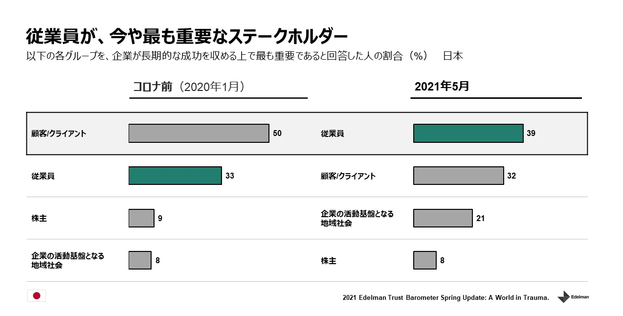 コロナ禍により、企業が重要視すべきステークホルダーの優先順位にも変化が起きています。企業が長期的な成功を収める上で最も重要なステークホルダーは「従業員」であると回答した日本人は39%で最多となりました。2019年秋に実施した調査では、「顧客/クライアント」が最も重要とされていたことから、コロナ禍を経て従業員と顧客の重要度が逆転したことが分かります。これは、世界でも同じ傾向が見られます。