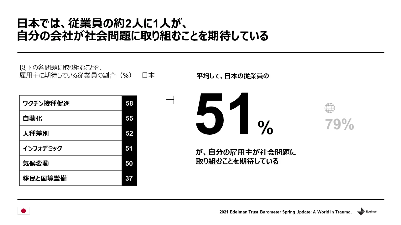 「自分の勤務先」に対する信頼度は、14カ国平均で77%、日本でも59%と、政府、企業、メディア、NGO/NPOと比べて引き続き最も高く、情報源としても「自分の勤務先」が発信する情報は、政府やメディアが発信する情報よりも信頼されています。そして、最重要ステークホルダーとなった従業員の2人に1人(日本:51%、14カ国平均:79%)が、「自分の勤務先」が社会的課題に取り組むことを期待していることからも、コロナ禍により人々の社会的課題への問題意識が高まったことは明らかです。