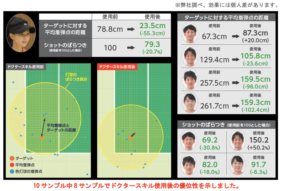 Dr.SKILL使用前後の打球エリアの面積比較では、測定したソフトテニスプレーヤー5人すべてが使用後の打球エリアが狭く収束※し、ボールを捉えているエリアの正確性がアップ。また、ターゲットに対する平均着弾点の距離とショットのばらつきを比較したコントロール性能差の検証では、10サンプル中8サンプルで使用後の優位性※を示しました。