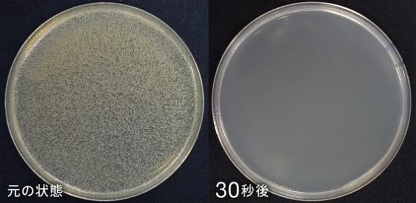 2.9×10^6CFU/mlの菌が本製品に触れてから30秒で消失。