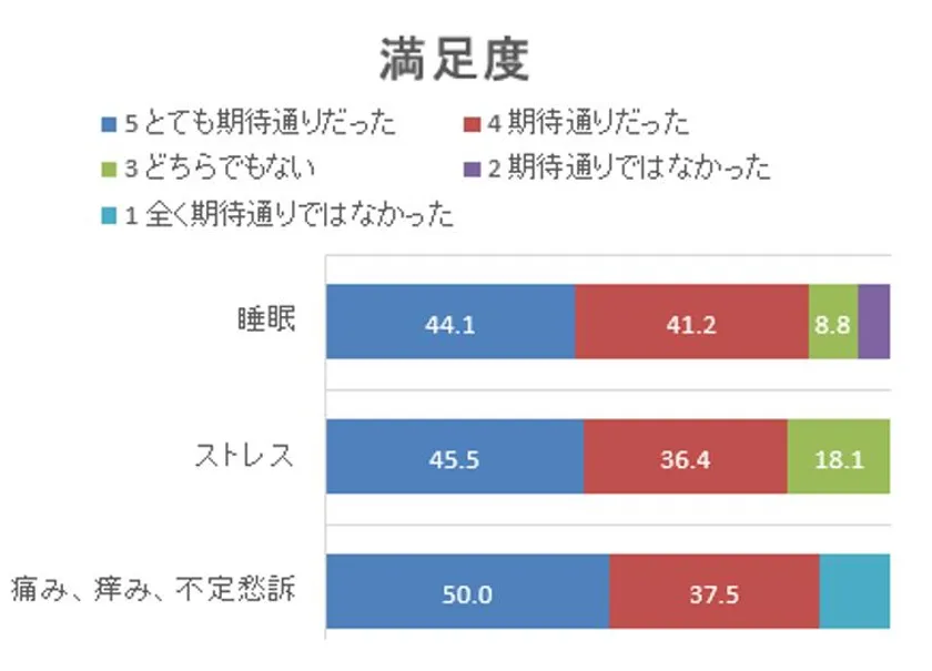 ・期待に対する満足度(5.とても期待通りだった、4.期待通りだった)は、睡眠改善が約85.3%、ストレス対策は約81.9%、痛みや痒み、不定愁訴は約87.5%(図8)