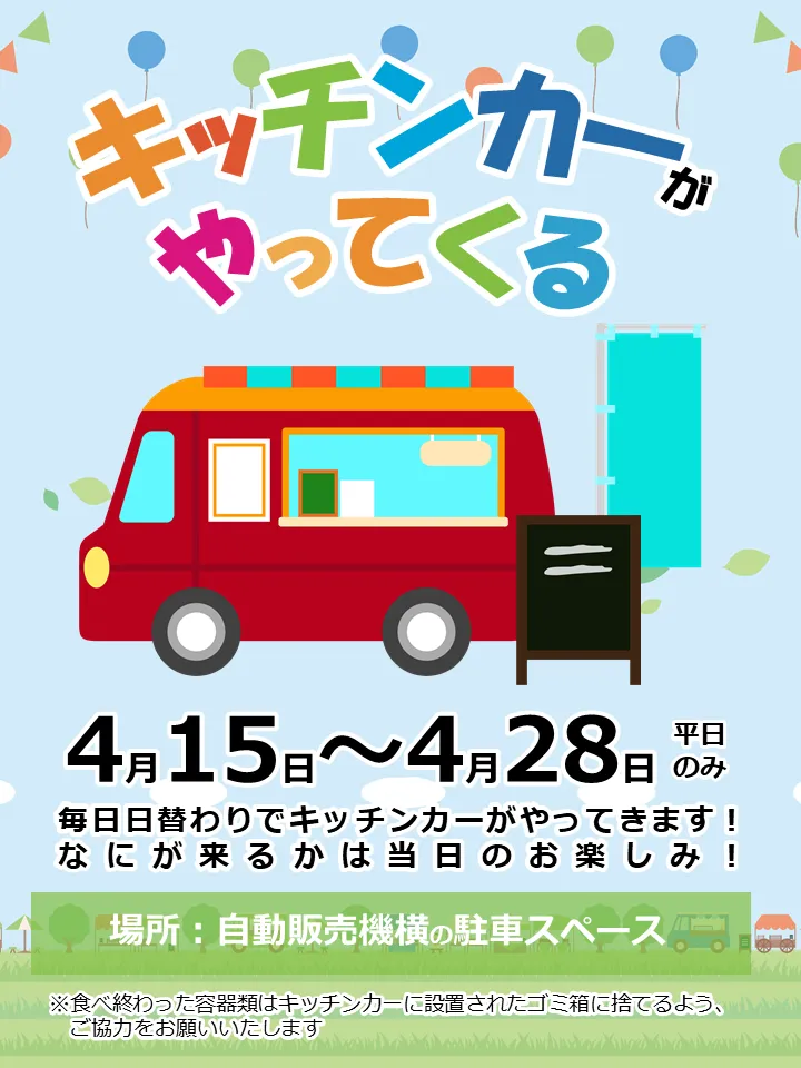 相談を受けた軒先社は当初テスト導入として関東近郊で運営しているキッチンカー事業者に無償で出店できる無料出店キャンペーンを実施(4/15~4/28)。結果、多くの事業者から申し込みを受け、日替わりでキッチンカーの出店が決まった。また生徒に対しても校内で告知を実施した。