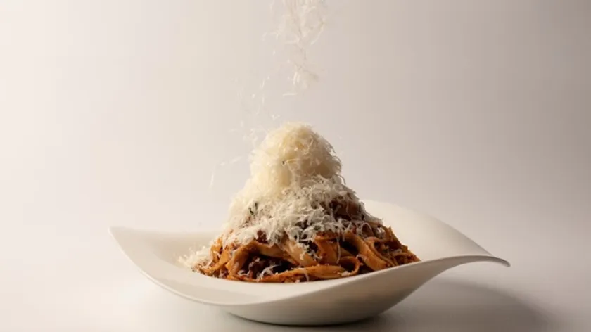 ひと皿ごとに削る熟成チーズによって、すっかり冠雪した富士山。麓から見えるは本格ボロネーゼ!
