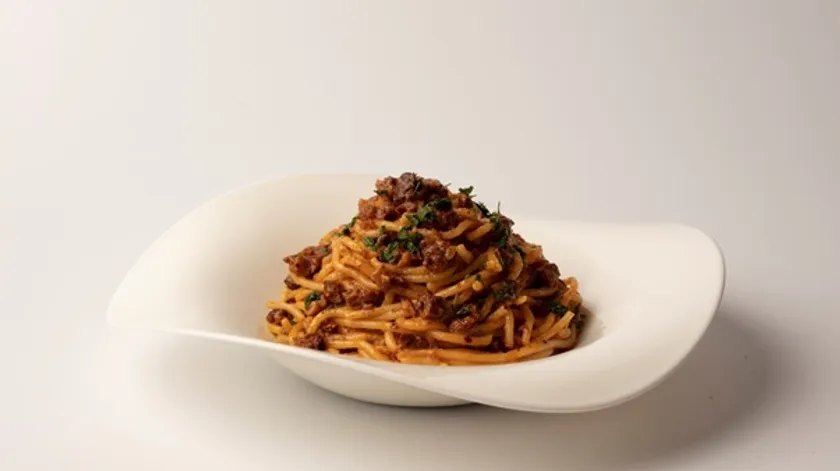 パスタがチーズに覆われ迷子に!?チーズの樹海をかき分けて召し上がる、チーズ好きにたまらないボロネーゼです。