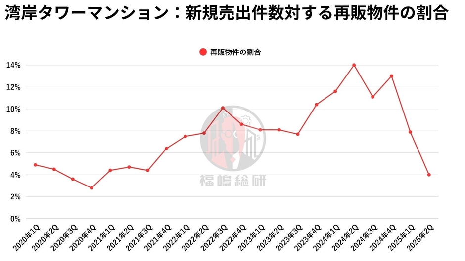 2024年まではこの割合が高まり、ピークを迎えていました。再販業者は短期的な利ざやを狙うため、価格上昇局面では積極的に仕入れを行い、市場に大量の再販物件が出回ります。ところが、2025年に入ってからは状況が一変。割合は大きく減少し、 コロナ禍以前の水準 にまで戻りました。