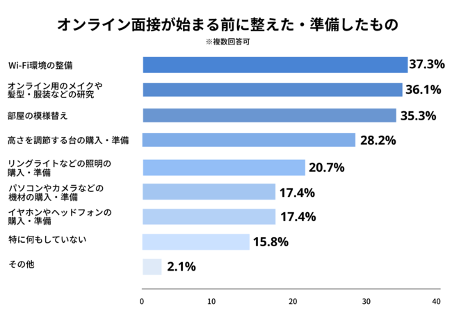 オンライン面接が始まる前に整えた・準備した上位3つは「Wi-Fi環境の整備」(37.3%)、「オンライン用のメイクや髪型・服装などの研究」(36.1%)、「部屋の模様替え」(35.3%)