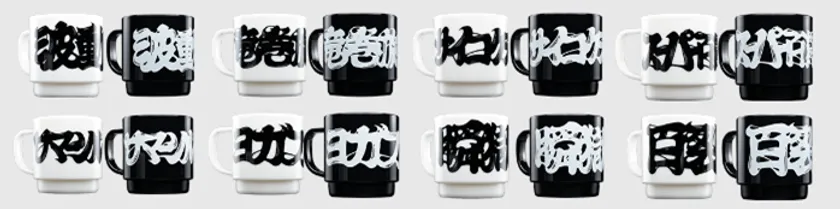 キャラクターの必殺技名にフォーカスし、漢字・仮名の必殺技名を力強く筆文字で表現したグラフィックを日本製のリサイクルPET100%の耐熱マグにプリントしました。