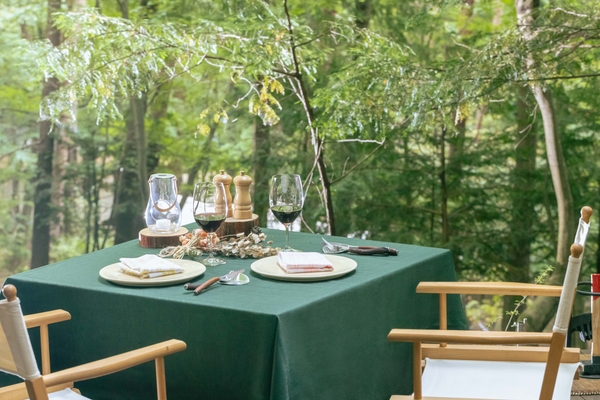 星のや富士の敷地内にあるウッドデッキに、テーブルやチェア、ブランケット、焚き火などを設え、屋外でも快適に過ごせる空間を用意します。やわらかな木漏れ日が差し込み、春の陽気を感じられる気持ちのよい空間で、優雅に春のひとときを楽しめます。
