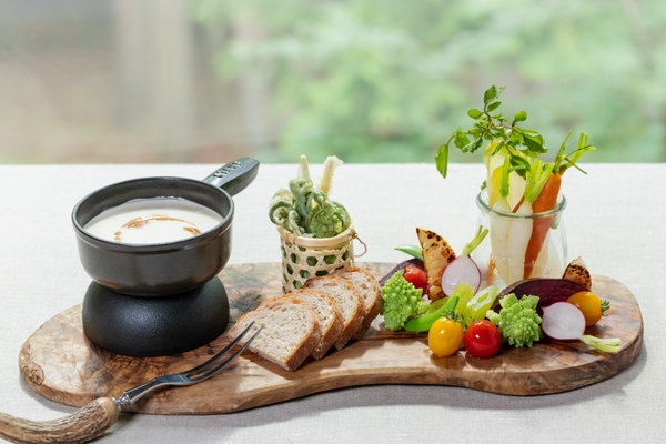山菜と狩猟肉をふんだんに使用したランチを提供します。前菜は、山菜の持つほろ苦さを味わえるバーニャカウダとフリットです。やわらかな肉質が特徴の鹿ロース肉は、石窯を使って塩釜焼きにします。塩釜を割った瞬間に感じる山椒の香りや、春の狩猟肉ならではの繊細な旨味を楽しめます。食後には山梨の郷土料理である「薄焼き」をアレンジしたデザートも用意します。
