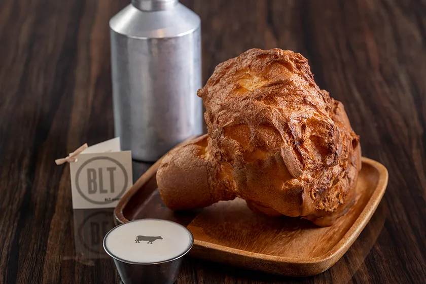 BLT STEAKではパンの代わりにお出しする名物料理。グリュイエールチーズをかけて焼き上げる、外はカリッ、中はしっとりとしたパンです。ホイップバターやお好みでコーシャーソルトをつけてお召し上がりいただきます。
