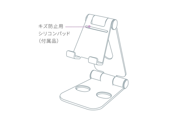 ・スマートフォンやタブレットなどと接触する底面および土台部分には、シリコン素材のパッドを敷いています。
