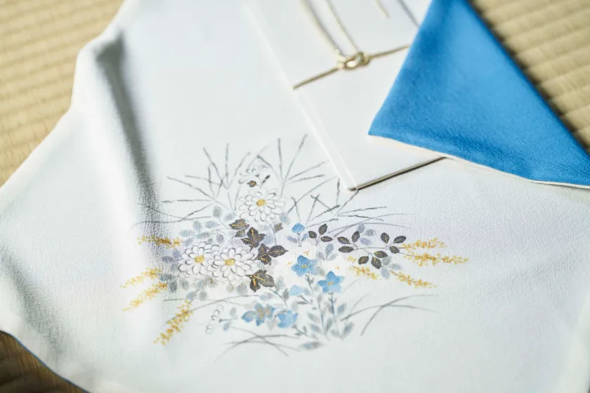 〈冬木小袖〉とは、尾形光琳が約300年前に、みずから筆をとって秋草の模様を描いたきものです。京都から江戸に出た光琳が滞在した深川の材木問屋、冬木家の夫人のために描いたといわれ、〈冬木小袖〉と呼ばれています。こうした「描絵小袖」は、まさに一点ものの特注品、当時裕福な女性の間で流行していました。