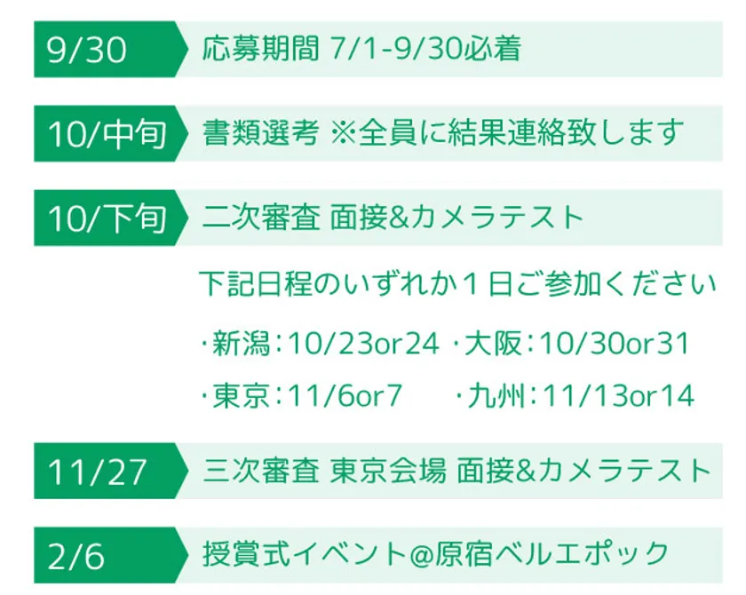二次審査(面接・カメラテスト):・新潟:10月23日(土)、24日(日)
