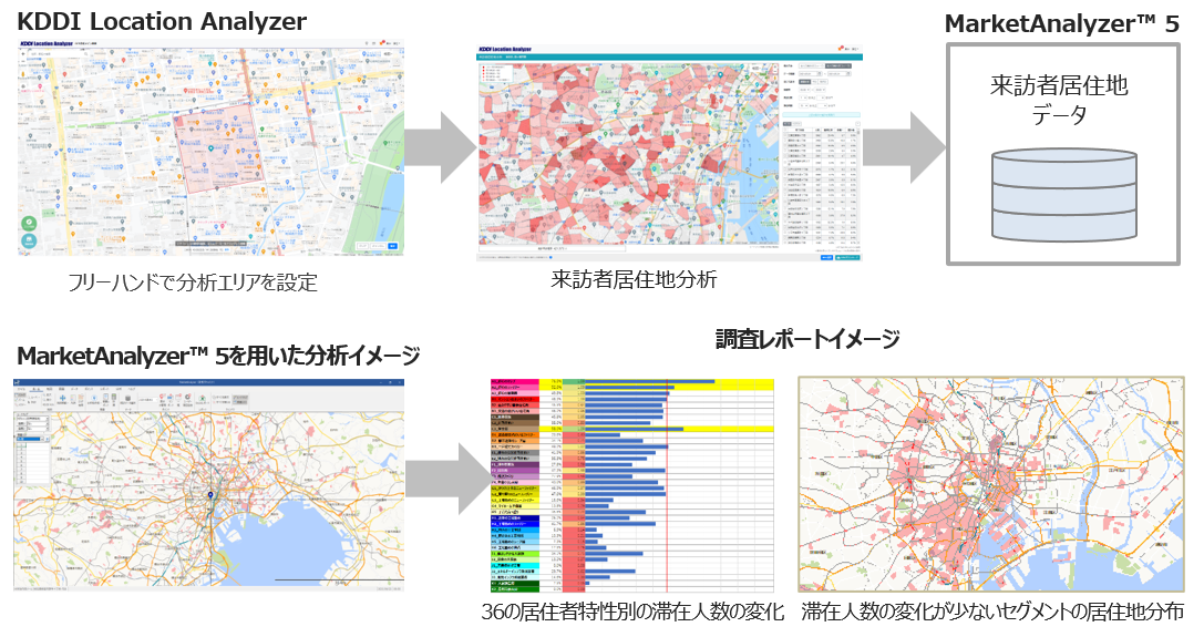 今回は、スマートフォンのGPS位置情報を搭載したGIS「KDDI Location Analyzer」と、今回新たに対応したエリア別の居住者特性を評価するデータ「c-japan(R)」を組み合わせて分析することで、滞在者の居住地の特性を利用して、減少率が低い居住特性のペルソナ像をあぶりだしました。