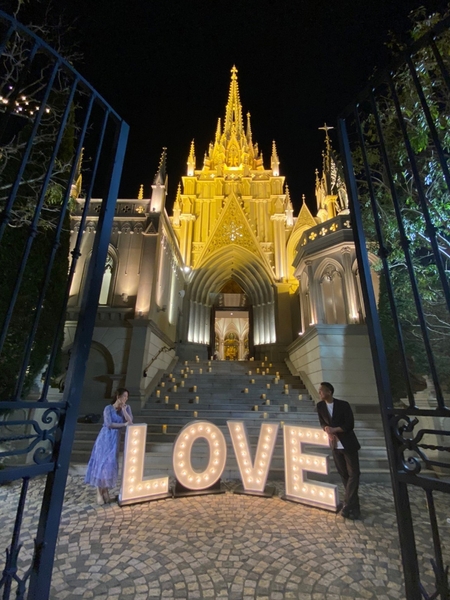 デコレーションされたチャペルの中で、生演奏をBGMに、特大花束とダイヤモンドのプロポーズリングでプロポーズ。スイートルームに入ると、窓から見える打ち上げ花火がおふたりの記念日を彩ります。